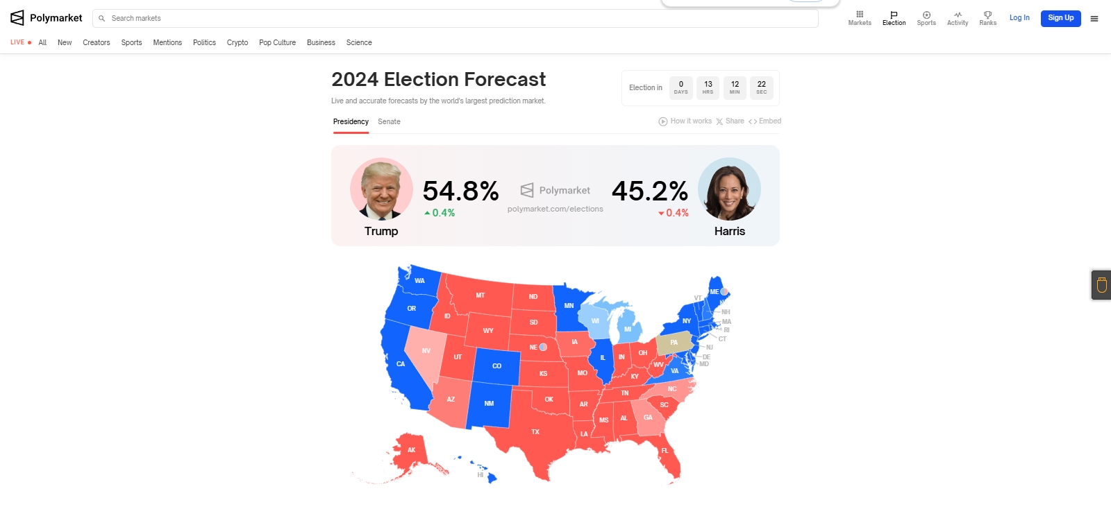 根据美国polymarket网站民调数据显示,北京时间11月4日10:48,共和党候选人川建國同志投票支持率达到54.8%,超过民主党候选人哈里斯9.6个百分点(45.2%),当然民调只是预测,最终结果将在11月5日揭晓。