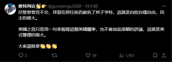 殖人啊,人家亨特·拜登是犯罪啊,这都能洗成政治牺牲品,美国不是法律国家吗?被彻底震惊了,美国YYDS,666!